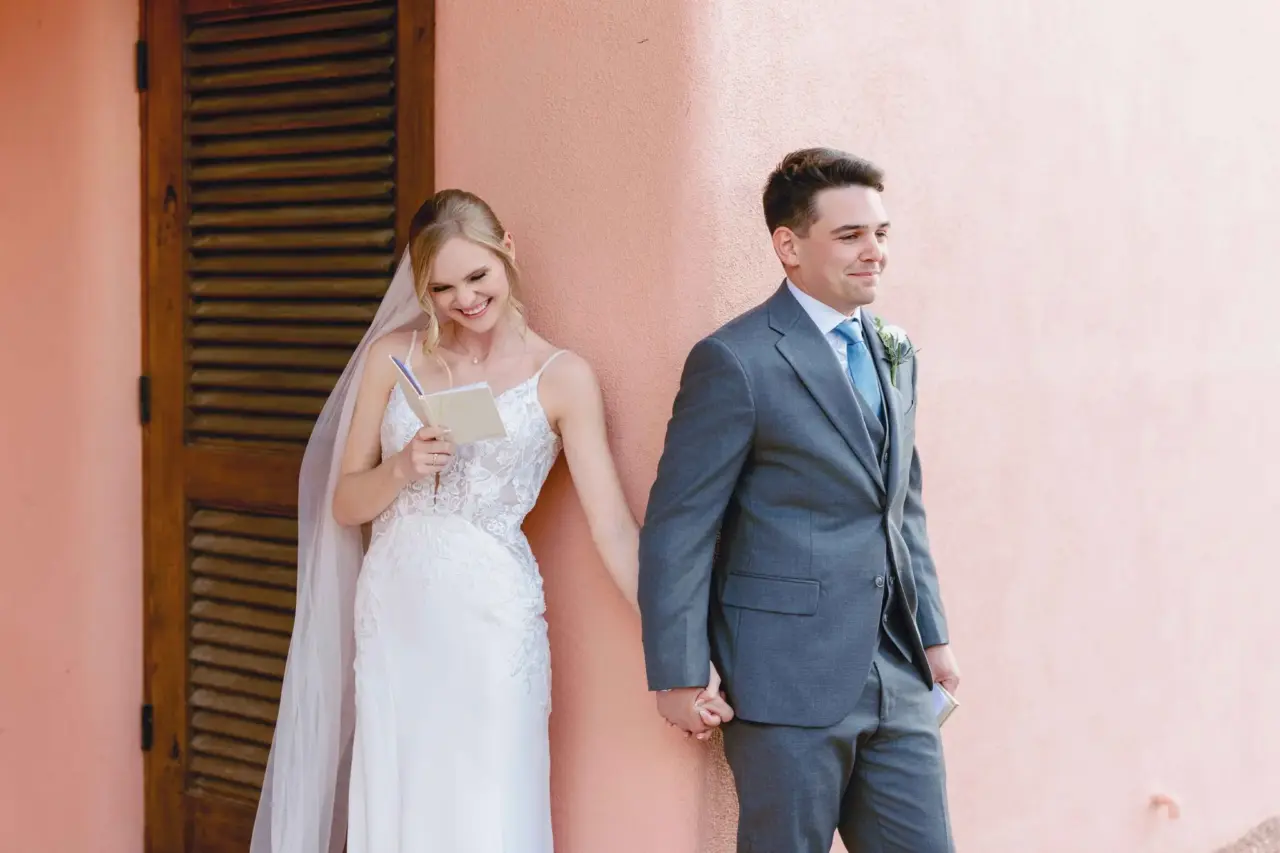 Egy menyasszony és vőlegény egy külső falnak támaszkodva állnak. A menyasszony egy jegyzetfüzetbe írt valamit olvas, míg a vőlegény, aki a sarkon áll, de fogja a kezét, mosolyog.